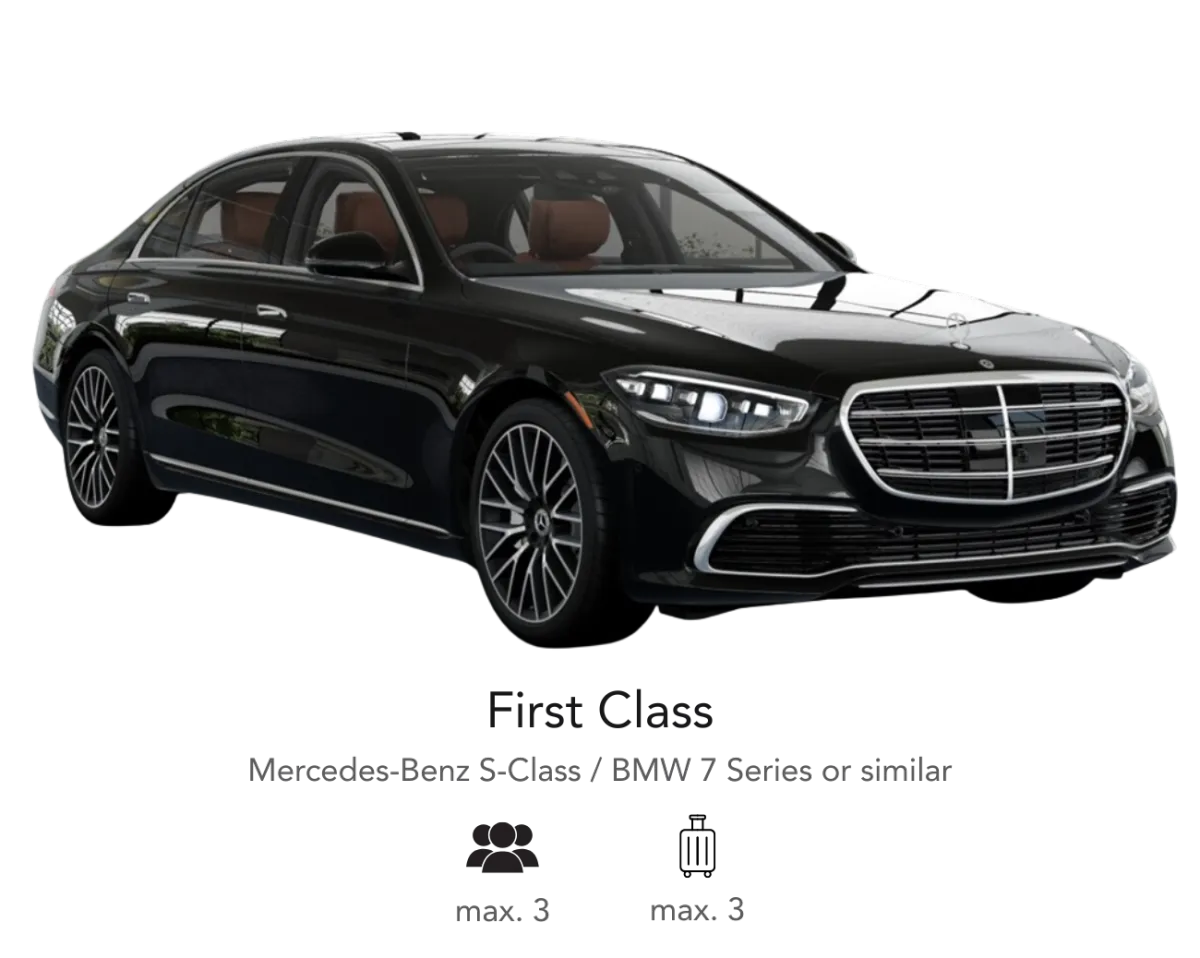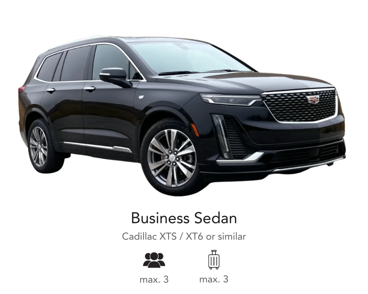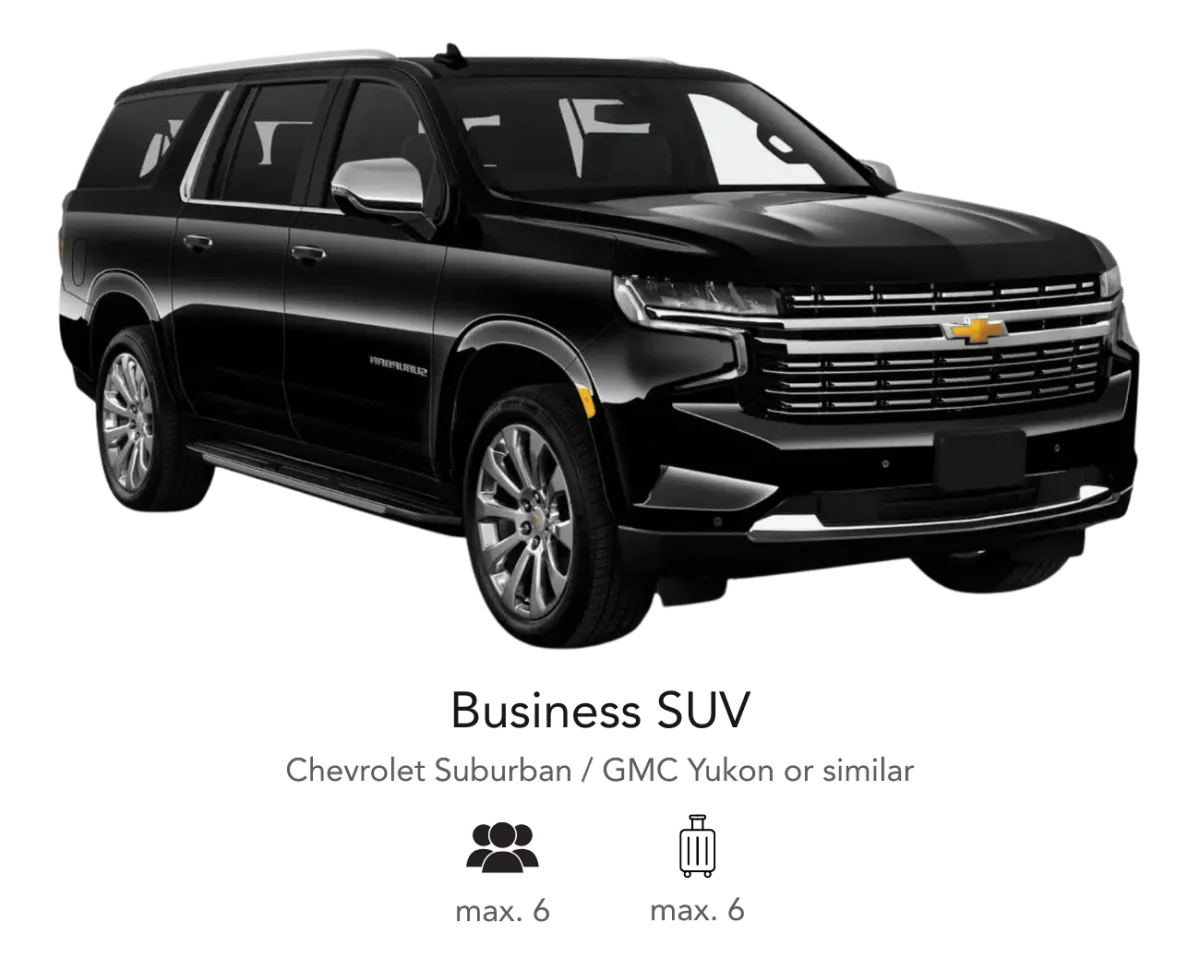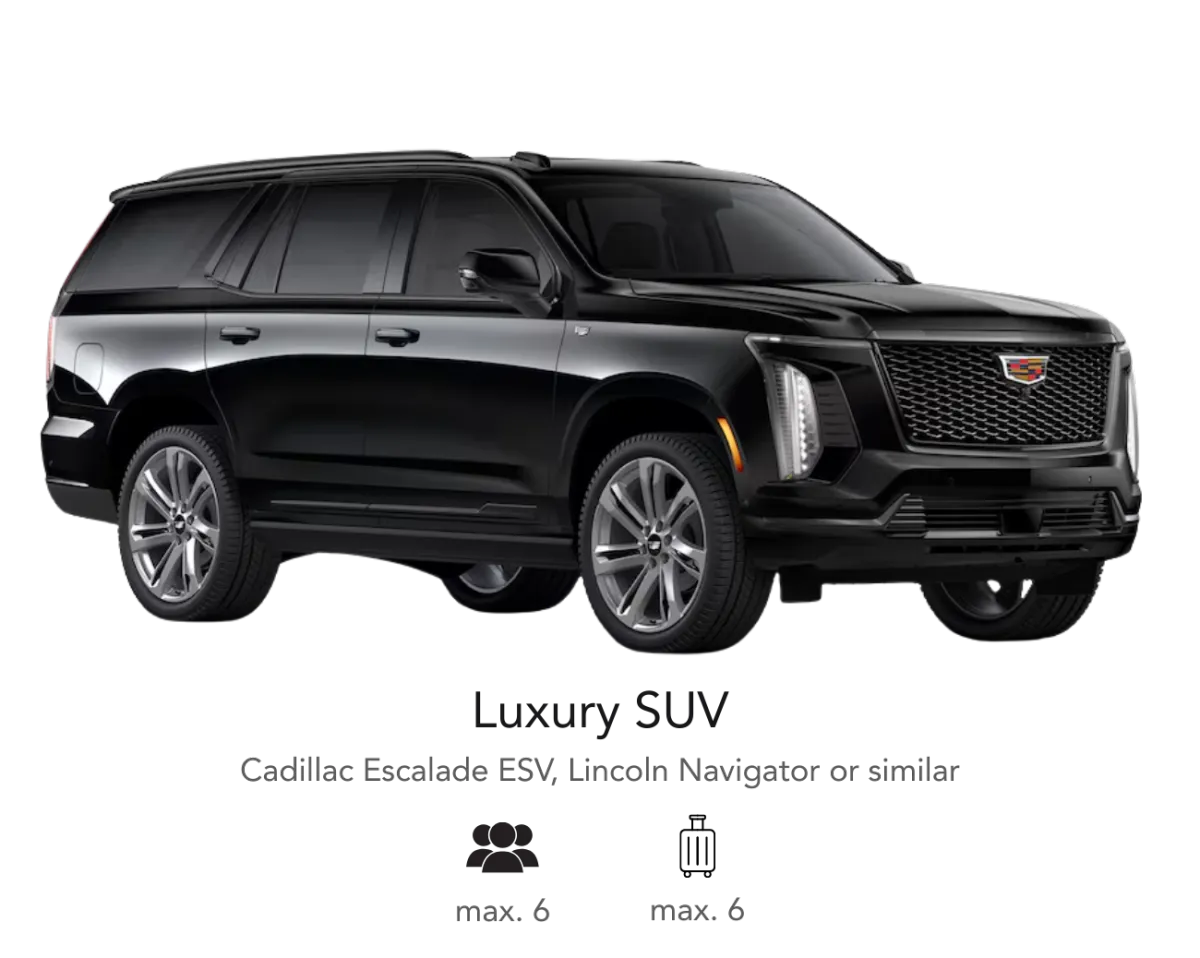 Our fleet includes luxury sedans, business sedans, business SUVs, and luxury SUVs. Vehicle availability is based on your booking and passenger needs.